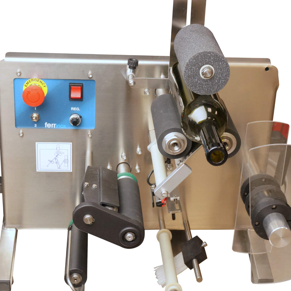 Maszyna umożliwia aplikację jednej lub dwóch etykiet samoprzylepnych z rolki. Obsługa jest intuicyjna – po umieszczeniu butelki między rolkami etykieta naklejana jest automatycznie. Następnie wystarczy wyjąć gotową butelkę i włożyć kolejną, co pozwala na płynną i powtarzalną pracę.